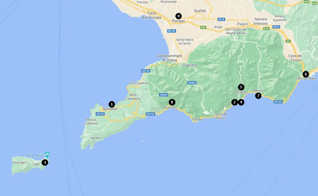 However, if you are looking for even more flexibility in being able to get from place to place in your own timeframe, renting a car is an effective option. If you plan on driving in Italy, the US consulate recommends obtaining an international driver’s license before departing for your trip. For a better idea of where the Amalfi Coast is located in relation to the large Italian cities and what the traveling time to the Amalfi Coast is from those cities, I have included a map in my Amalfi Coast Visitor guide for you to review below.