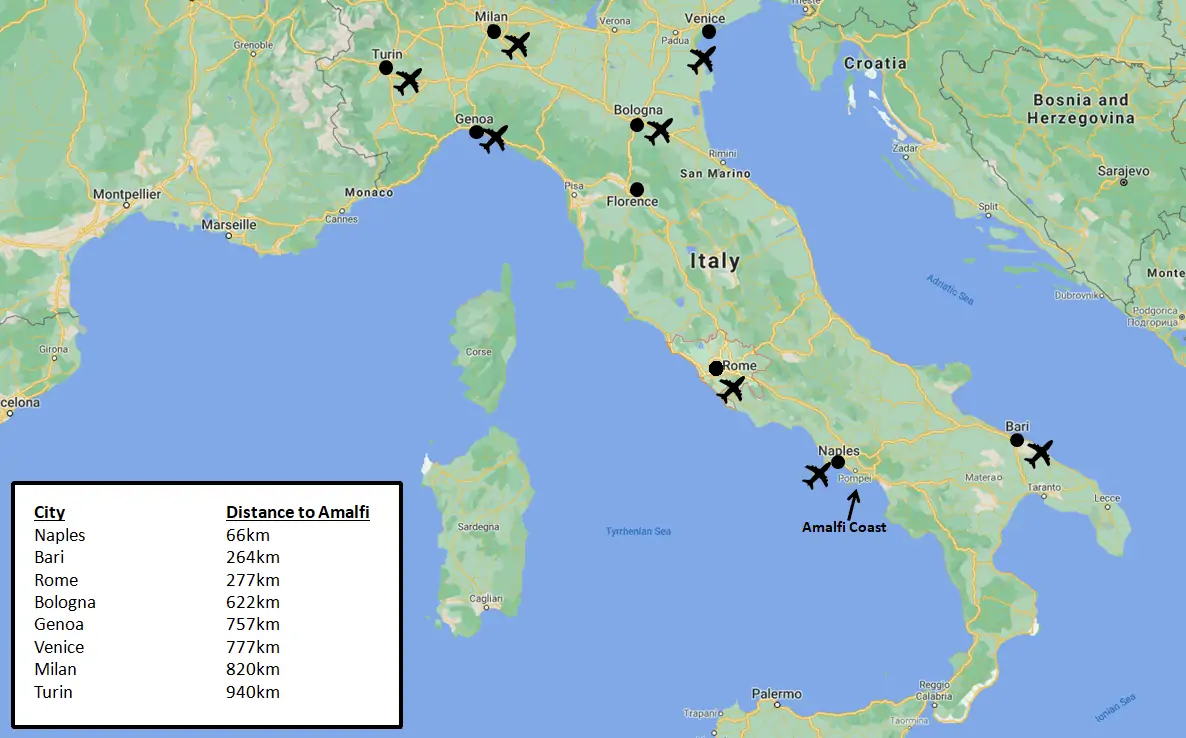 If you are traveling to the Amalfi Coast from outside of Italy, the quickest way to get there would be to fly into the Naples International Airport (NAP). For those who are traveling to the Amalfi Coast from elsewhere in Italy or Europe, in addition to being able to fly into Naples, you also have the option of taking the high-speed rail to Naples.