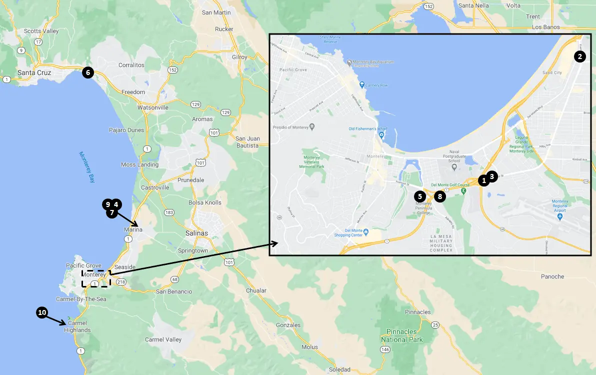 | Monterey, CA | 52 miles | 1hr |