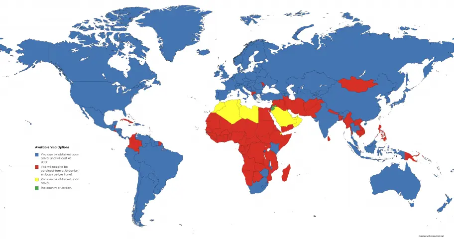 In addition to the passport requirements, there are VISA considerations in the Jordan entrance requirements that you need to be aware of before booking your travel. If you would like to review the VISA entry requirements for Jordan by country, I have included a map below for you to review. Depending on which country your passport was issued by, the method of obtaining your visa to enter Jordan will be different.