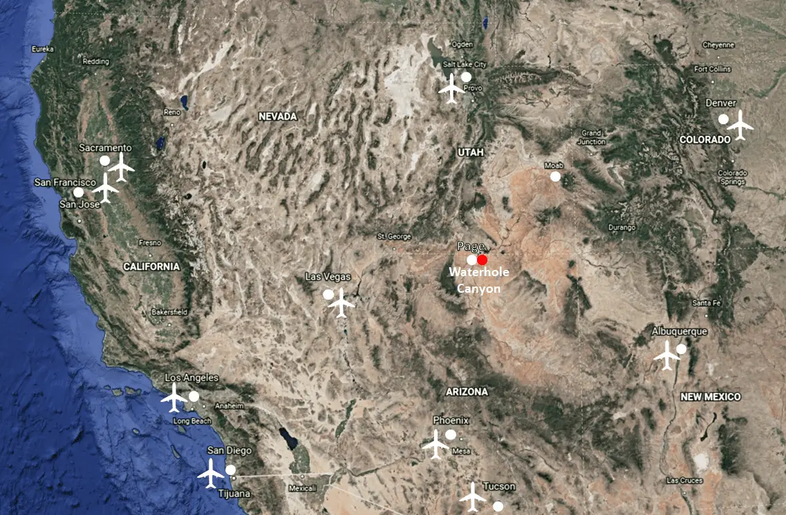 Suppose you are planning a trip to see the Waterhole Canyon and Page, Arizona’s other many attractions, and would like to review some airport options. In that case, I have included a map for you to review in my Waterhole Canyon guide below.