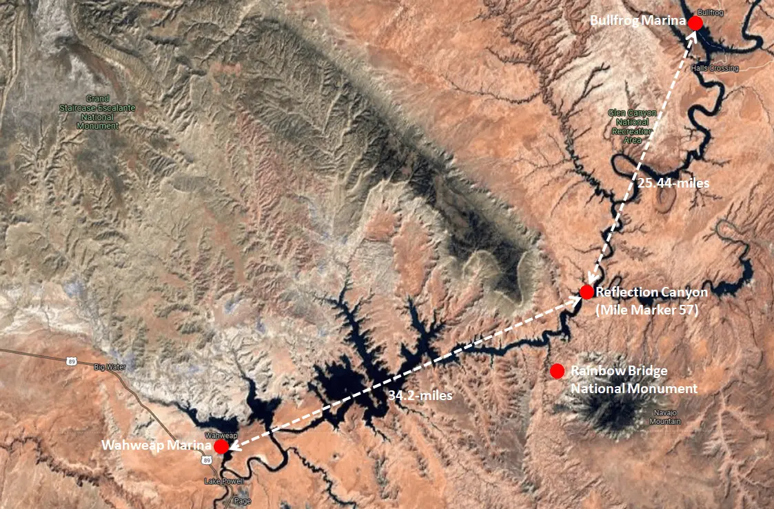 - Make sure you begin your trip early in the day as it is a long boat ride to Reflection Canyon from either marina. On a straight line, it is roughly 25 miles from Bullfrog Marina and 34 miles from Wahweap Marina, but you will be following the contours of the lake, so the distance is actually much longer from each.