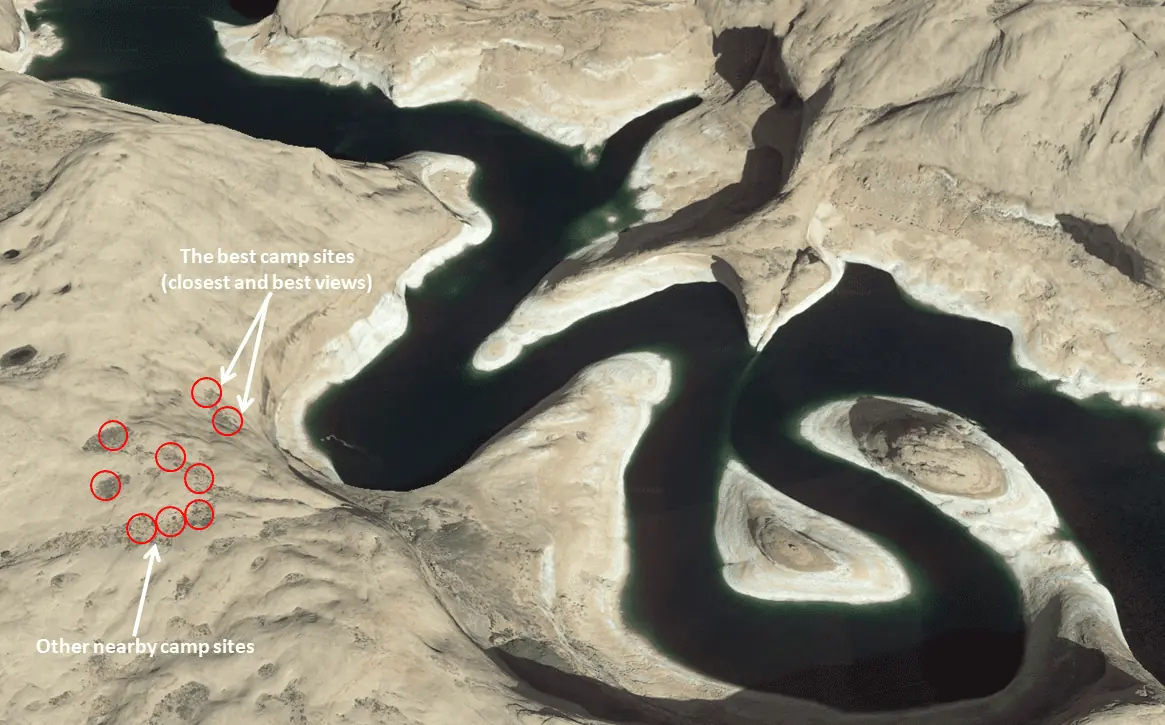 - Be aware that the number of good campsites near Reflection Canyon is limited because most of the area is hard rock. There are a few sandy areas that you can put tent stakes into, but they get taken quickly. Reflection Canyon frequently gets high winds, so getting to the canyon early and getting to one of these spots is important.