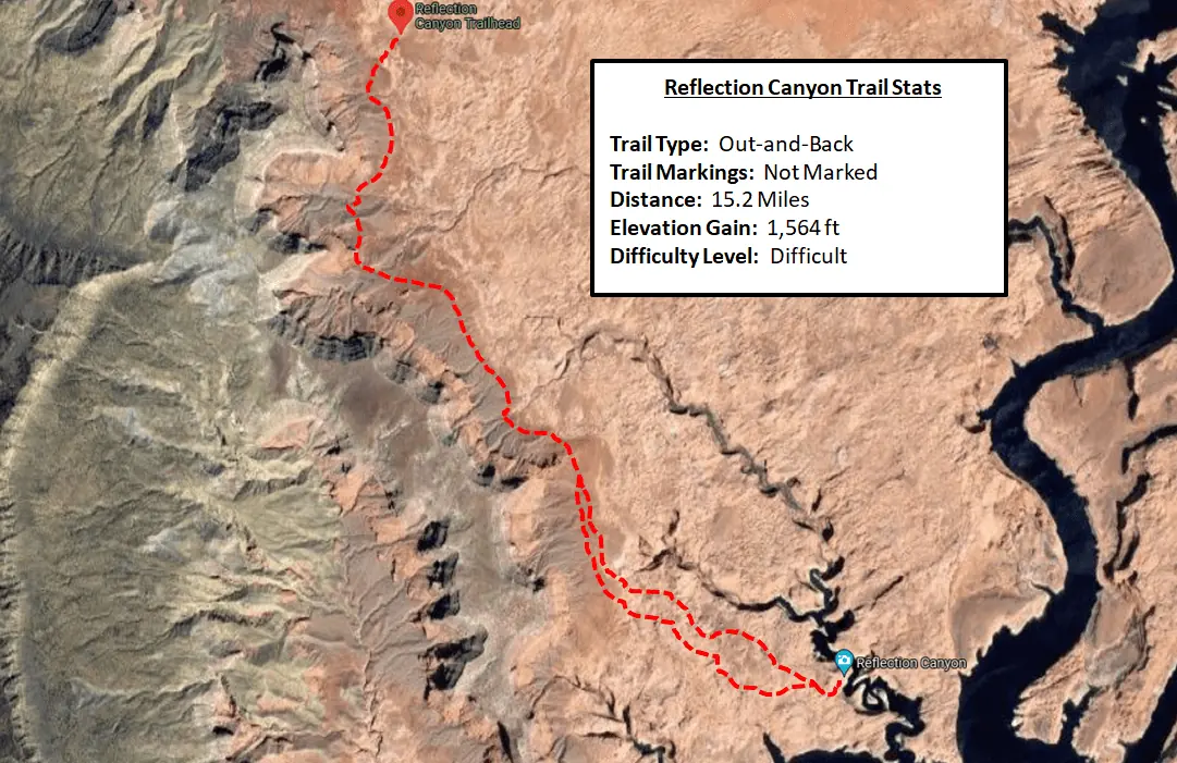 As you can see by the trail stats map above, the Reflection Canyon hike is not easy no matter what time of the year you are visiting. This out-and-back trail measures just over 15 miles round trip and has over 1,500 feet of elevation climb throughout.