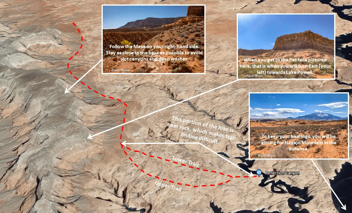 Those resources should help you find your way to Reflection Canyon and back safely. However, if you want to be extra sure of your direction when hiking, I would strongly recommend signing up for the Pro version of the Alltrails App or investing in a Garmin InReach GPS device and setting up waypoints to assist you in your navigation.