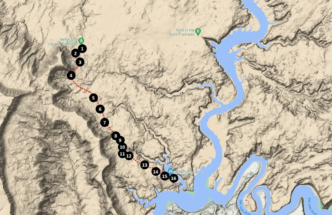 One of the most important steps to preparing for any hike is to understand what to expect while you are on the trail. Understanding the landscape and the obstacles that you will face while on a hike will allow you to better prepare the gear and supplies that you bring with you. To give you a better understanding of what the trail looks like, I have included GPS-tagged pictures on a map in my Reflection Canyon trail guide below to illustrate what you can expect while on this hike.