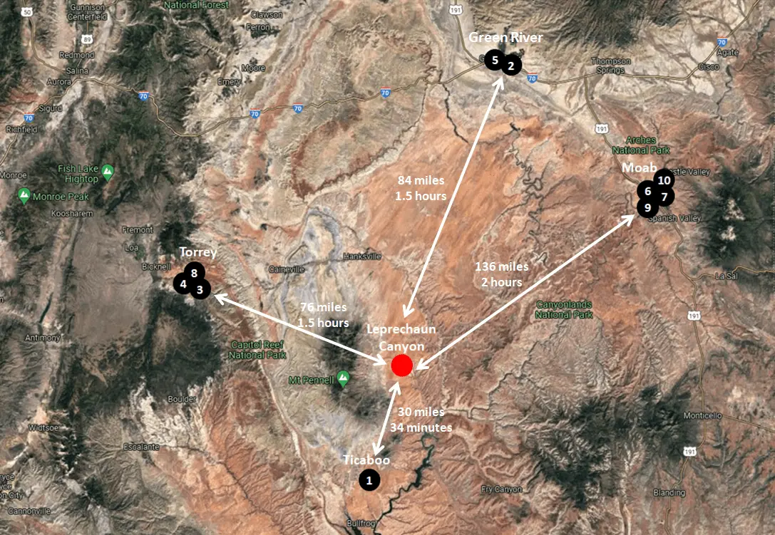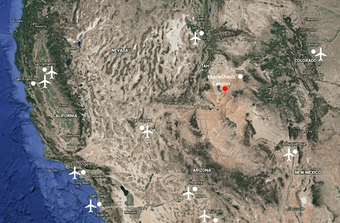 If you are visiting Southern Utah from outside of the state or outside of the country, you will want to fly into one of the large airports in the American Southwest. The closest airports will be in Las Vegas, Nevada, or Salt Lake City, Utah. For an idea of where Leprechaun Canyon is located in relation to the large cities in the American Southwest, please review the airport map I included in my Leprechaun Canyon trail guide above.