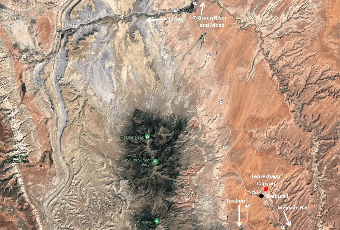 Once you are in Southern Utah, you can use the Leprechaun Canyon slot directions map that I have included below to get to the slot canyon. I have also included sets of written directions to Leprechaun Canyon from the cities of Moab, Torrey, and Mexican Hat in my Leprechaun Canyon trail guide for you to review as well.