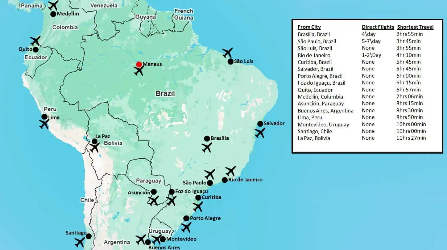 One of the most important decisions you must make when planning your trip to Manaus is how you will get there. If traveling from the United States, GOL and Azul Airlines offer direct flights to Manaus from Miami, Florida, and Fort Lauderdale, Florida respectively. Otherwise, United Airlines, Delta Airlines, and American Airlines offer direct flights from the United States to São Paulo and Rio de Janeiro. From there, you can book a connecting flight with another airline to Manaus.