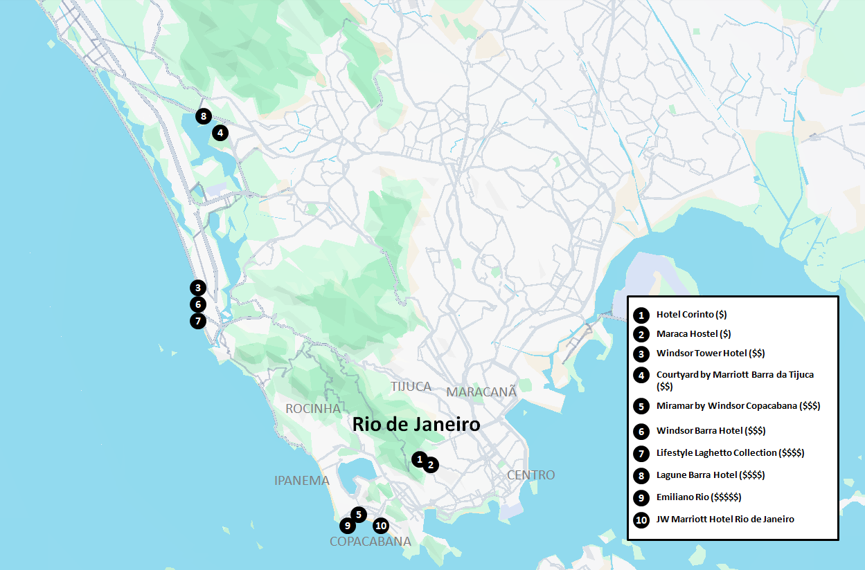 To help you find accommodations for your time in Rio de Janeiro, I have included a map and list of hotels and other accommodations at different price points for you to review below.