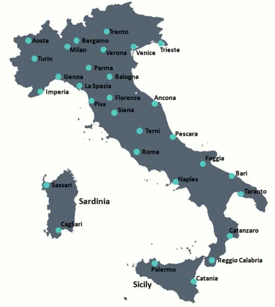This is not only to see if you would like to visit and tour these cities but also because they will typically be your ports of entry and transportation hubs as you visit them on your trip. To help you with this, I have included a map of some of the key cities within Italy that you will want to become familiar with below.