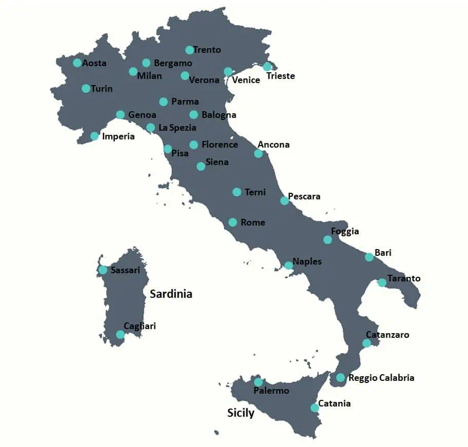 This is not only to see if you would like to visit and tour these cities but also because they will typically be your ports of entry and transportation hubs as you visit them on your trip. To help you with this, I have included a map of some of the key cities within Italy that you will want to become familiar with below.