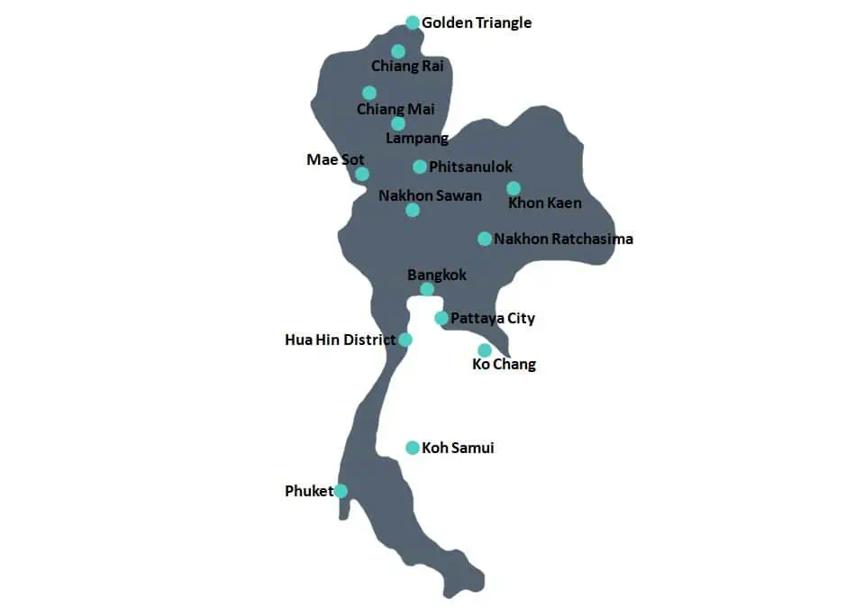 Not only to see if you would like to visit and tour these places, but also because these places will typically be your ports of entry and transportation hubs as you visit on your trip. To help you with this, I have included a map of some of the key cities and places within Thailand that you will want to become familiar with below.
